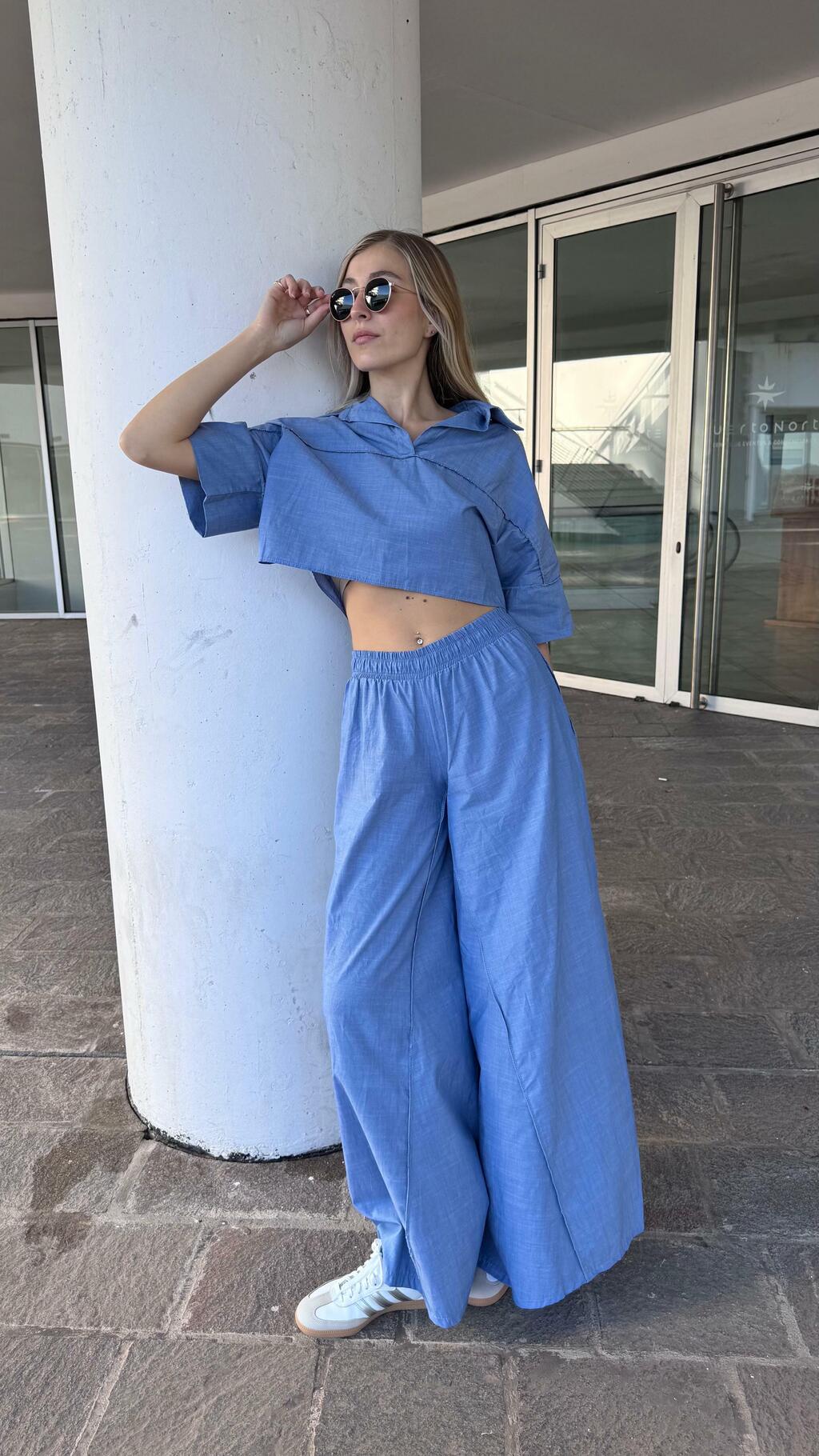 Camisa holgada, diseño sin botones. Corte por encima del ombligo con mangas tres cuartos
