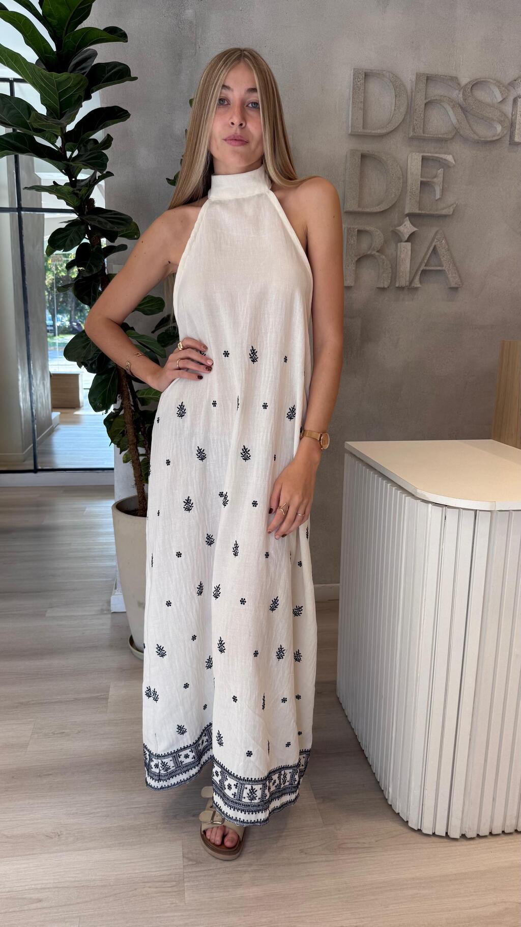 Vestido bordado, con cuello halter para regular y espalda descubierta.