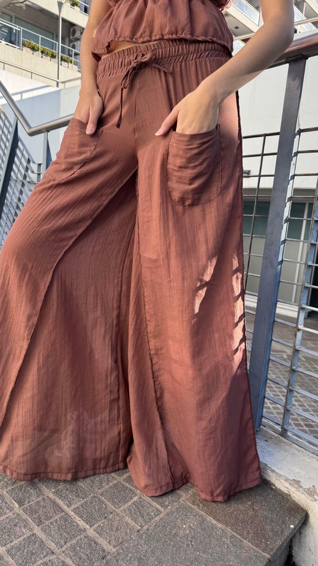 Palazzo super wide chocolate, con recortes que suman textura y un toque sofisticado, marcando un estilo único.
