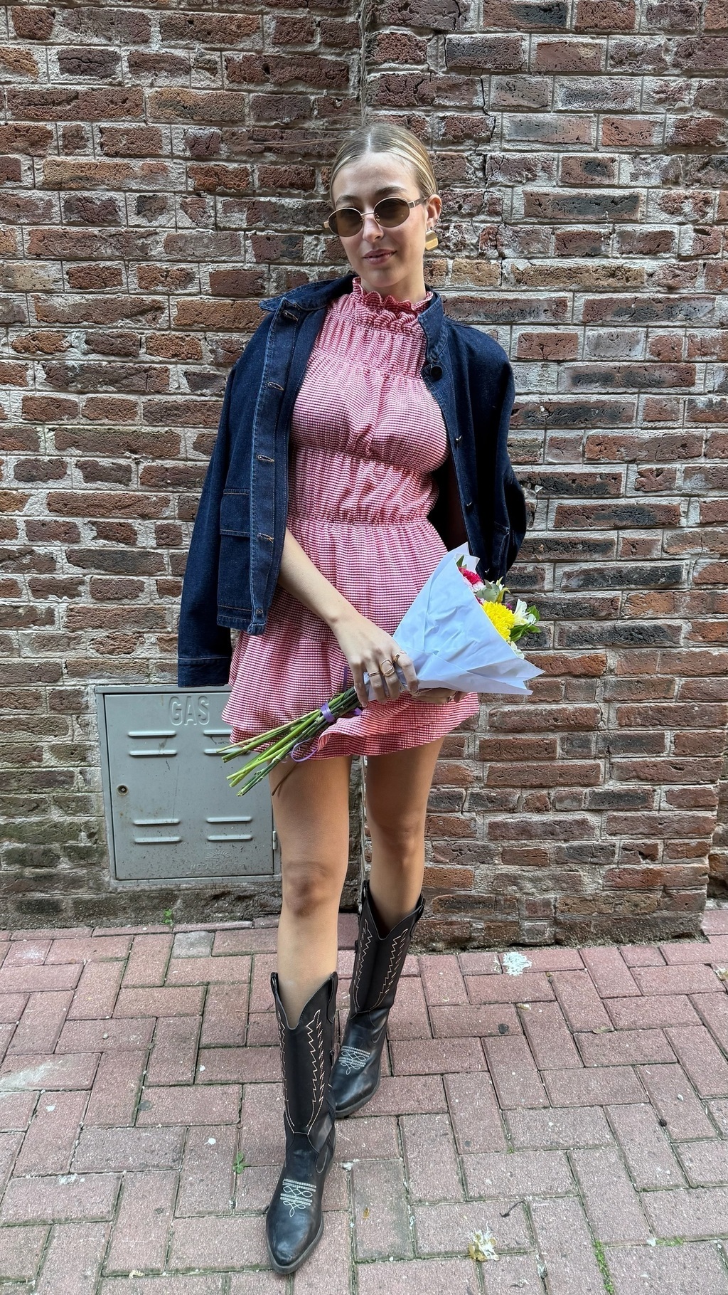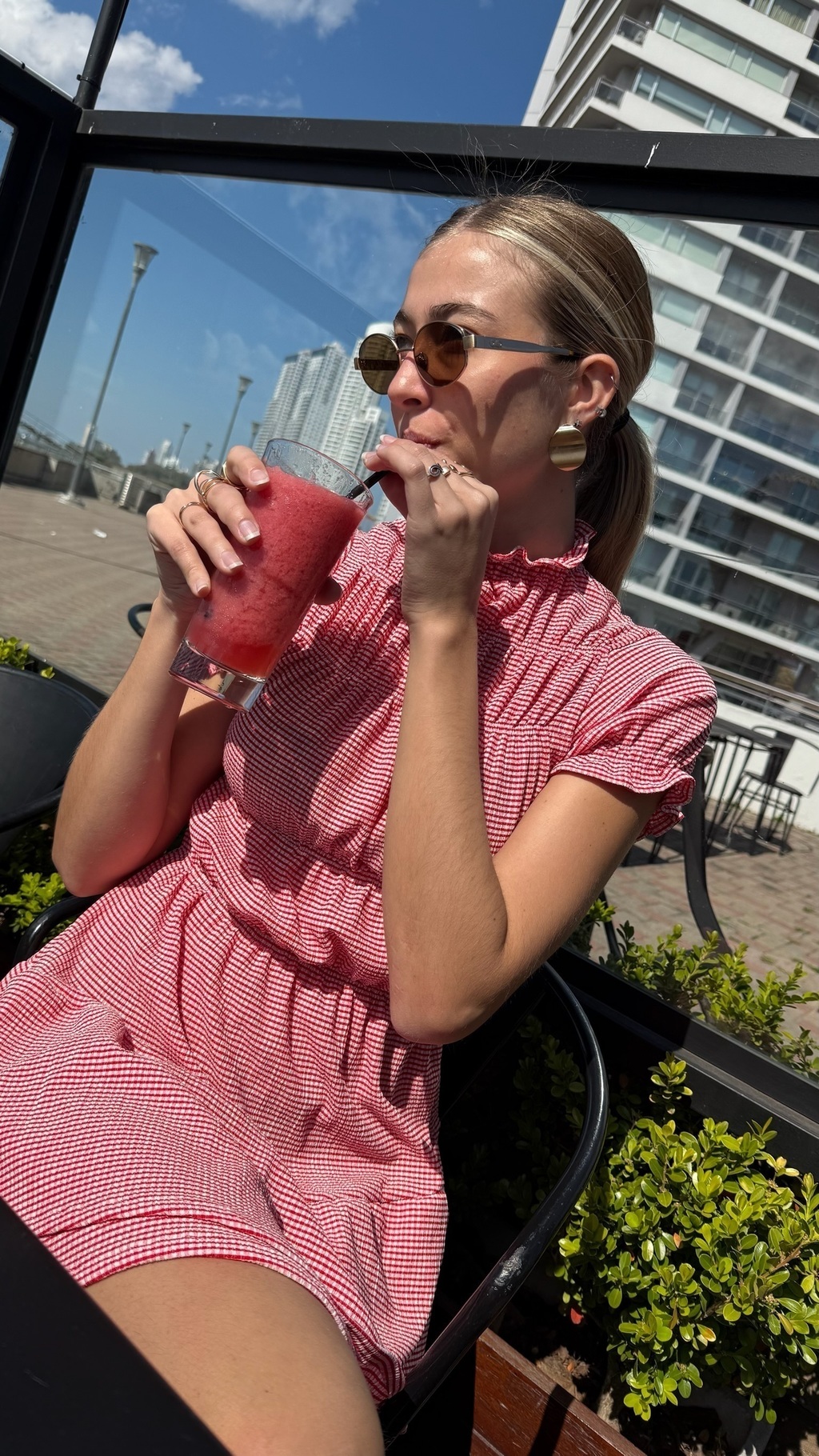 Vestido corto a cuadrillé con diseño fresco , confeccionado con frunces y delicados volados