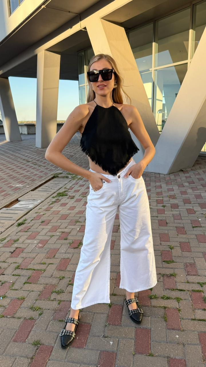 Top con espalda descubierta para atar. En color crudo, negro y blanco.